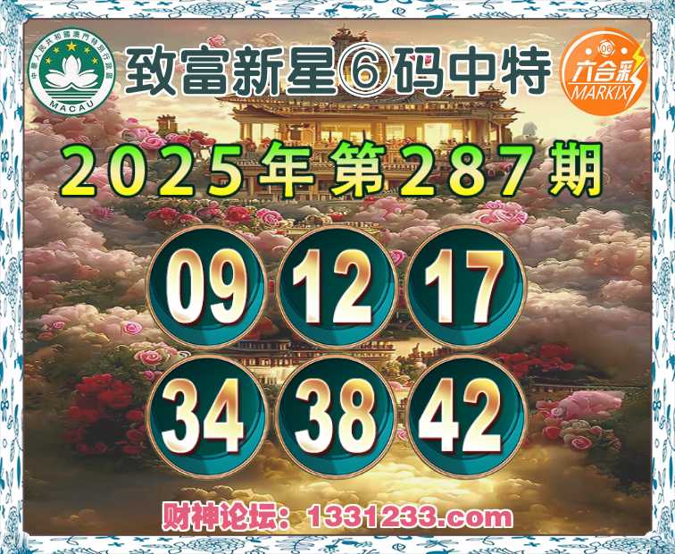 287期:【致富新星】 ⚽⑥码中特⚽【09.12.17.34.38.42】开:34准