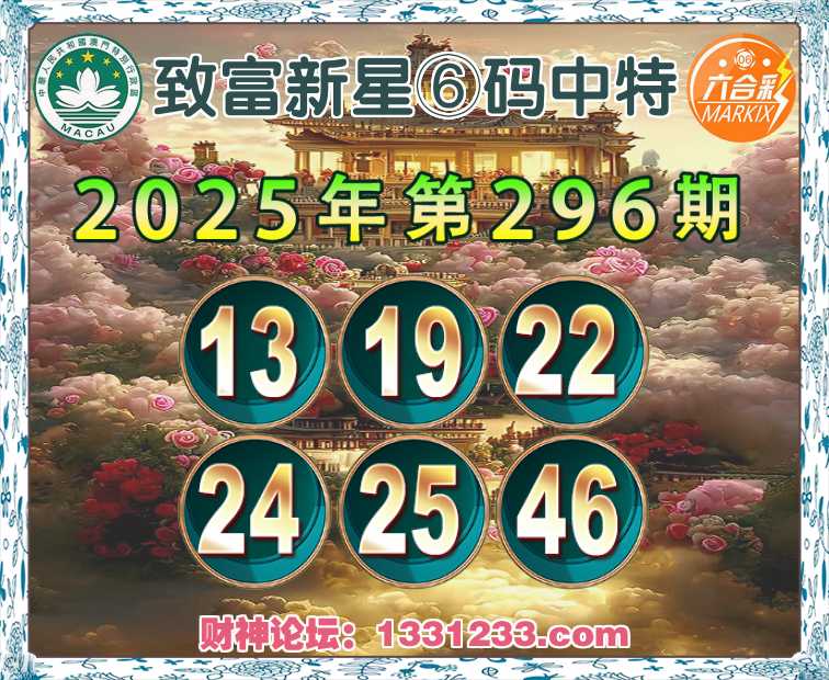 296期:【致富新星】 ⚽⑥码中特⚽【13.19.22.24.25.46】开:22准