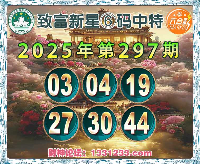 297期:【致富新星】 ⚽⑥码中特⚽【03.04.19.27.30.44】开:44准