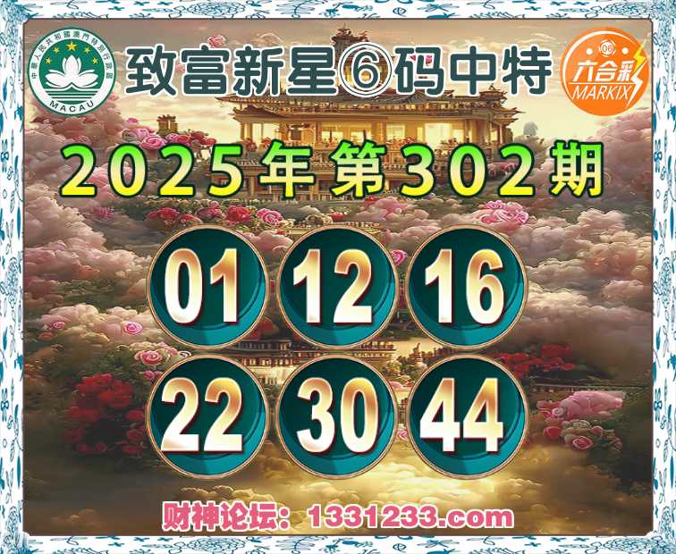 302期:【致富新星】 ⚽⑥码中特⚽【01.12.16.22.30.44】开:22准