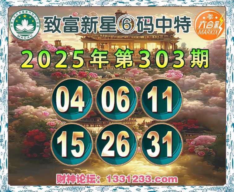 303期:【致富新星】 ⚽⑥码中特⚽【04.06.11.15.26.31】开:15准